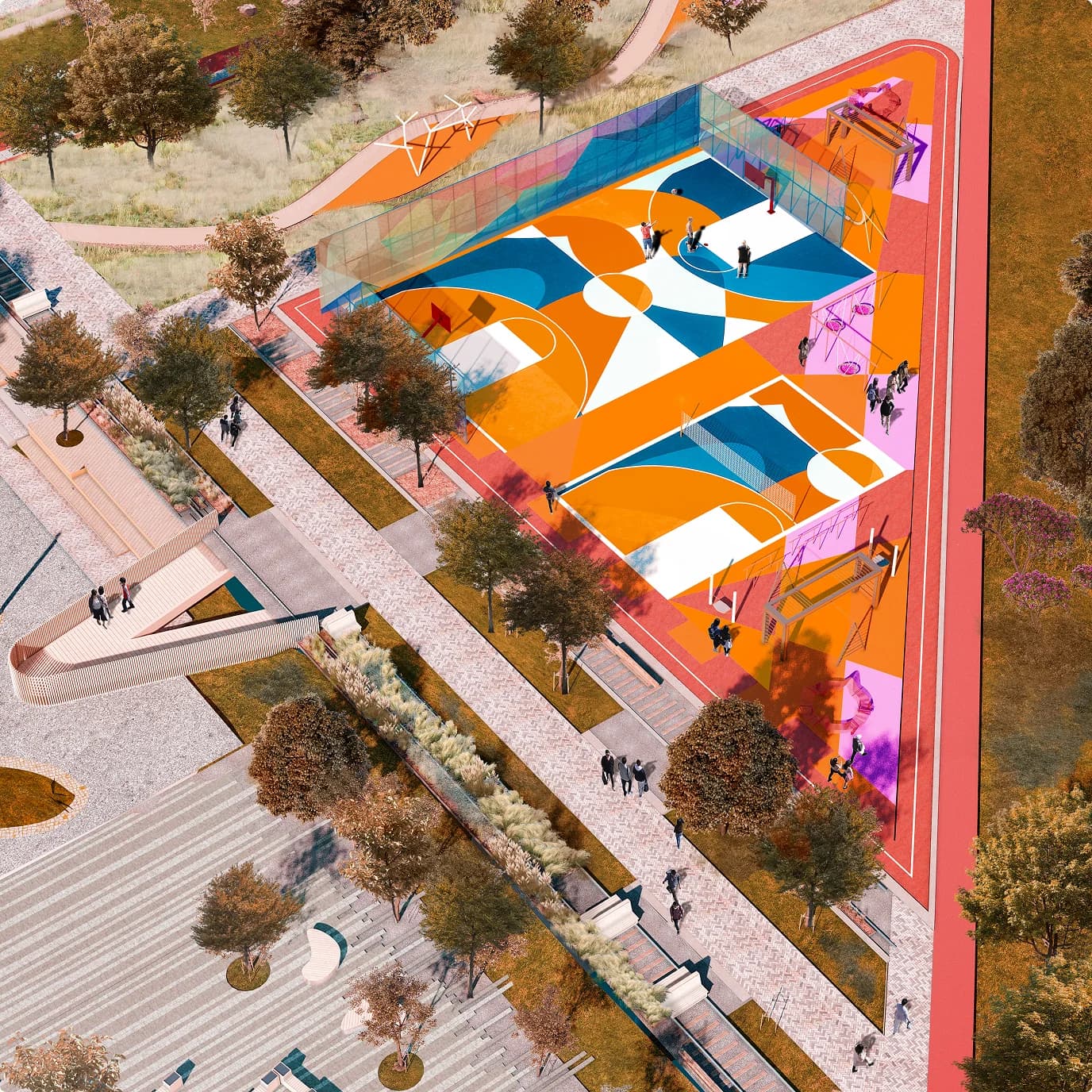 Обеспечение связности через пешеходные мосты, велодорожки, парковки для велосипедов и остановку общественного транспорта